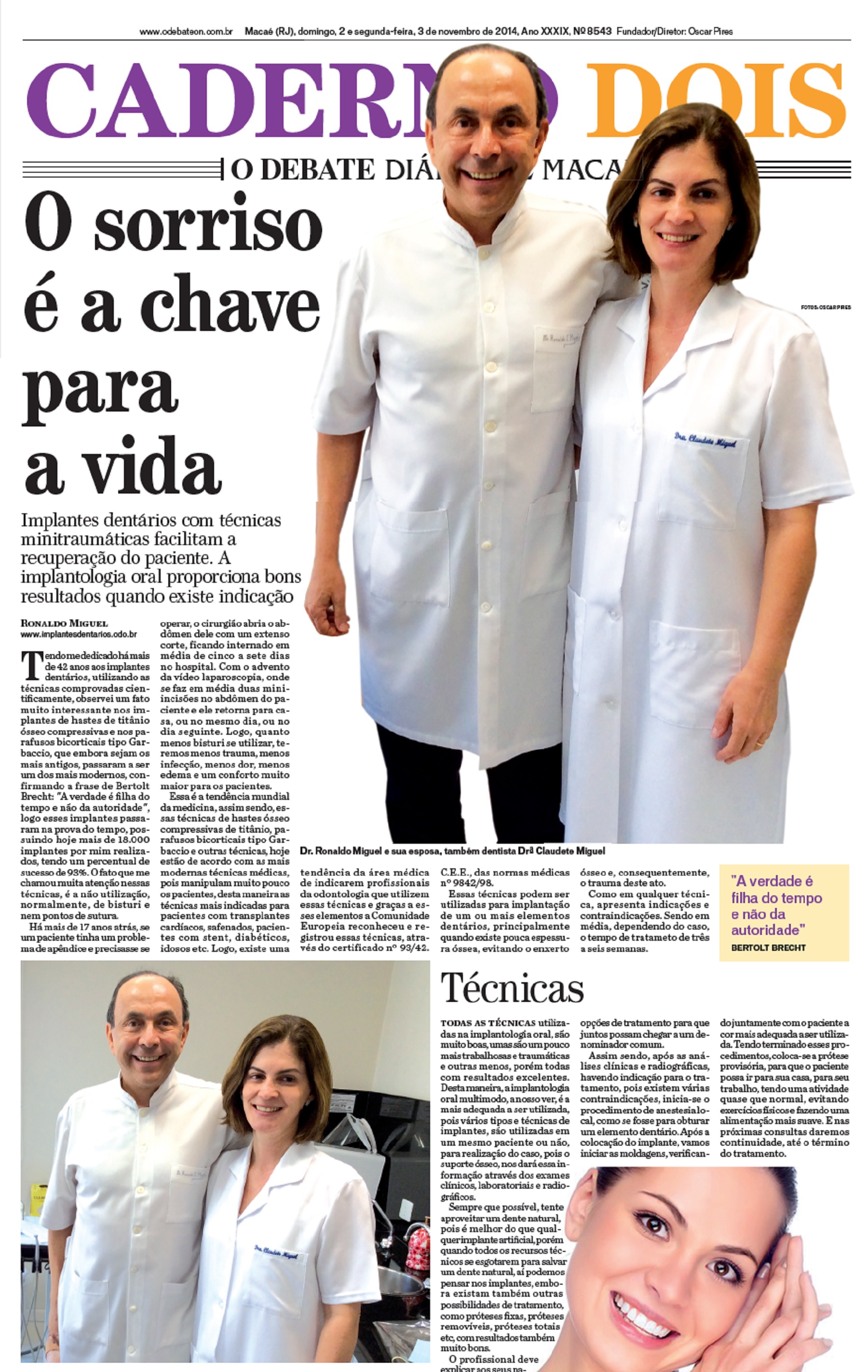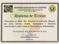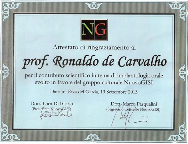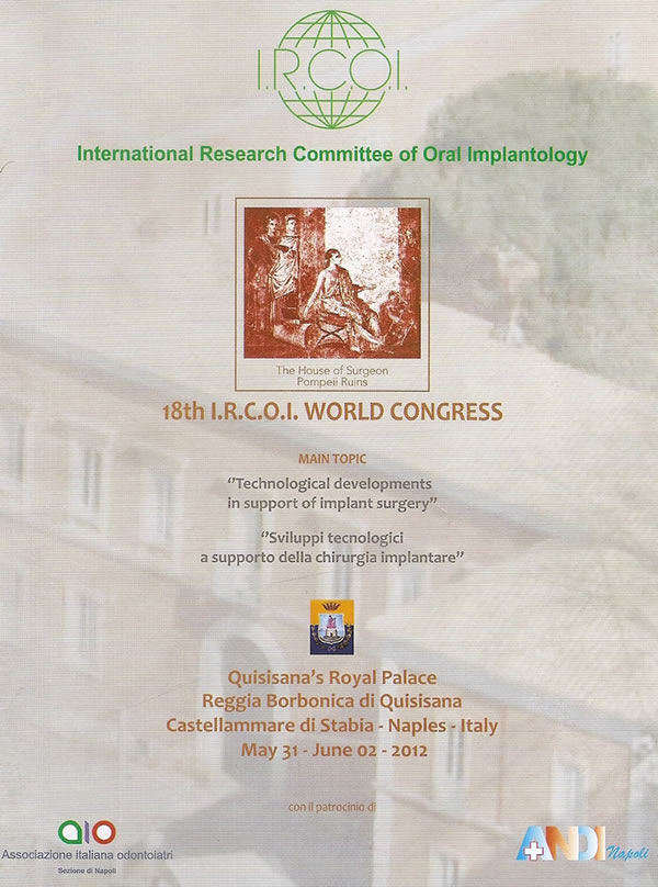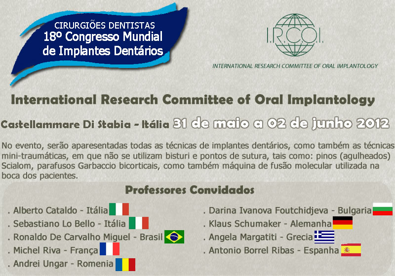 Conferência realizada no 18º Congresso Mundial I.R.C.O.I (Internacional Research Comitee of Oral Implantology) de 31 de maio a 02 e junho de 2012, em Castellammare di Stabia - Napoles - Itália, onde também foi eleito Prof. Dr. Ronaldo Miguel, juntamente com o Professor M. Riva (Orange-França), Vice-Presidentes do Congresso.
