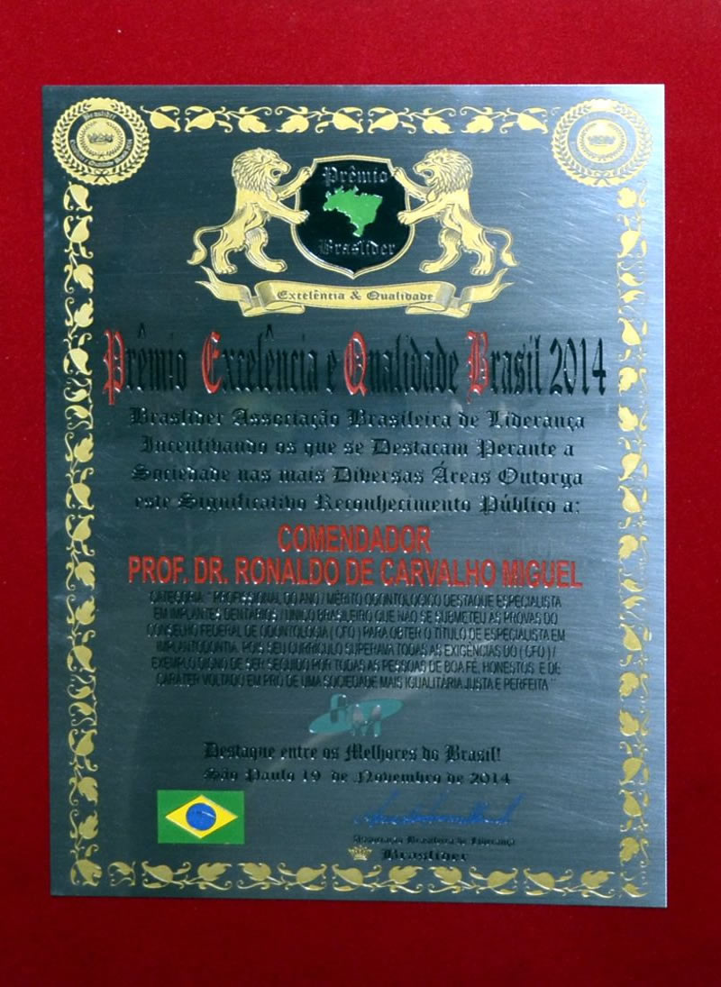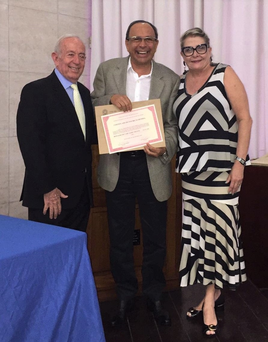 Dr. Ronaldo Miguel, recebendo do Presidente do Conselho Regional de Odontologia - RJ. Dr. Outair Bastazine, com a Dra. Glória, o Título Remido, por merecer o reconhecimento da classe Odontológica, considerando que no decorrer de toda a sua vida profissional, nunca sofreu qualquer penalidade por infração á Etica. Dezembro de 2016